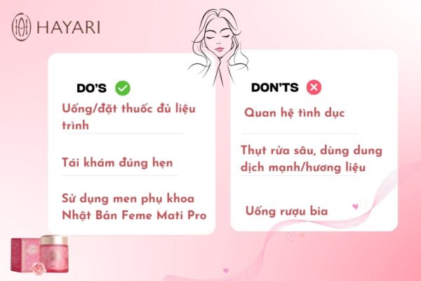 •  Tái khám đúng hẹn và uống/đặt thuốc đủ liệu trình: Nàng đừng quên tái khám đúng hẹn và uống/đặt thuốc đủ liệu trình, dù triệu chứng đã đỡ. Việc ngưng sớm có thể khiến vi khuẩn hay nấm còn sót lại, dễ gây tái phát. Hoàn thành đầy đủ quá trình điều trị chính là cách tốt nhất để “cô bé” hồi phục trọn vẹn và khỏe mạnh lâu dài.