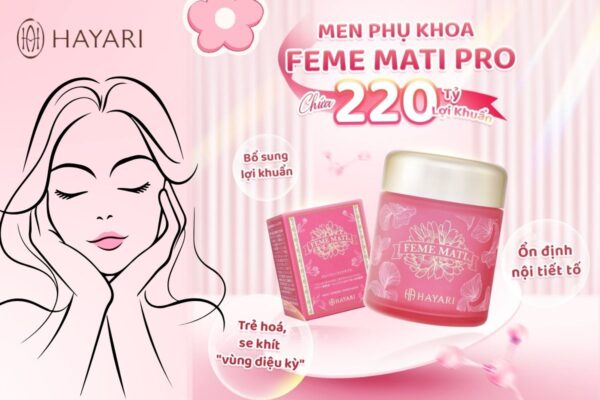 • Sử dụng viên uống phụ khoa Nhật Bản Feme Mati Pro: Để phòng ngừa tái phát, nàng có thể kết hợp men vi sinh phụ khoa phụ khoa Nhật Bản Feme Mati Pro. Khác với thuốc đặt chỉ xử lý tại chỗ, Feme Mati Pro chăm sóc từ bên trong, giúp tăng sức đề kháng vùng kín và giảm nguy cơ viêm nhiễm lặp lại. Bí quyết nằm ở 220 tỷ lợi khuẩn Probiotics, hỗ trợ tái cân bằng hệ vi sinh âm đạo, ức chế vi khuẩn và nấm có hại, đồng thời duy trì độ pH lý tưởng. Nhờ vậy, “cô bé” luôn được bảo vệ vững chắc, khỏe mạnh và nàng thêm thoải mái, tự tin mỗi ngày.