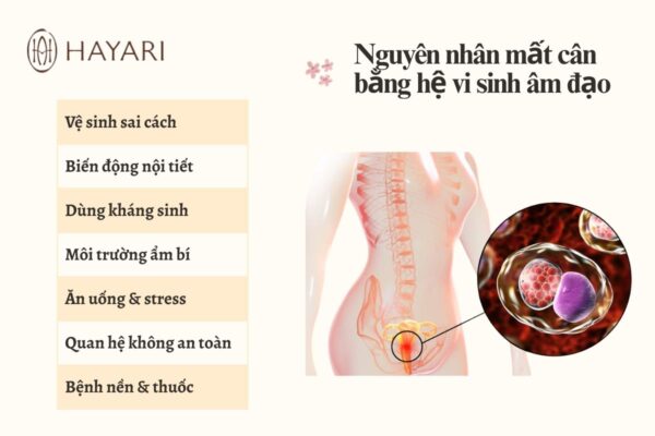 Hệ vi sinh âm đạo rất nhạy cảm, dễ bị ảnh hưởng bởi nhiều yếu tố như: tuổi tác, nội tiết tố (chu kỳ kinh nguyệt, thai kỳ, sau sinh hay giai đoạn tiền mãn kinh), sử dụng kháng sinh hoặc hormone, thói quen vệ sinh không đúng cách, quan hệ tình dục, chế độ dinh dưỡng hay căng thẳng kéo dài.