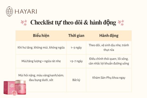 👉 Sốt, đau bụng dưới, khí hư hôi nặng/lẫn máu, hoặc không cải thiện sau 7–10 ngày tự chăm sóc nhé nàng.