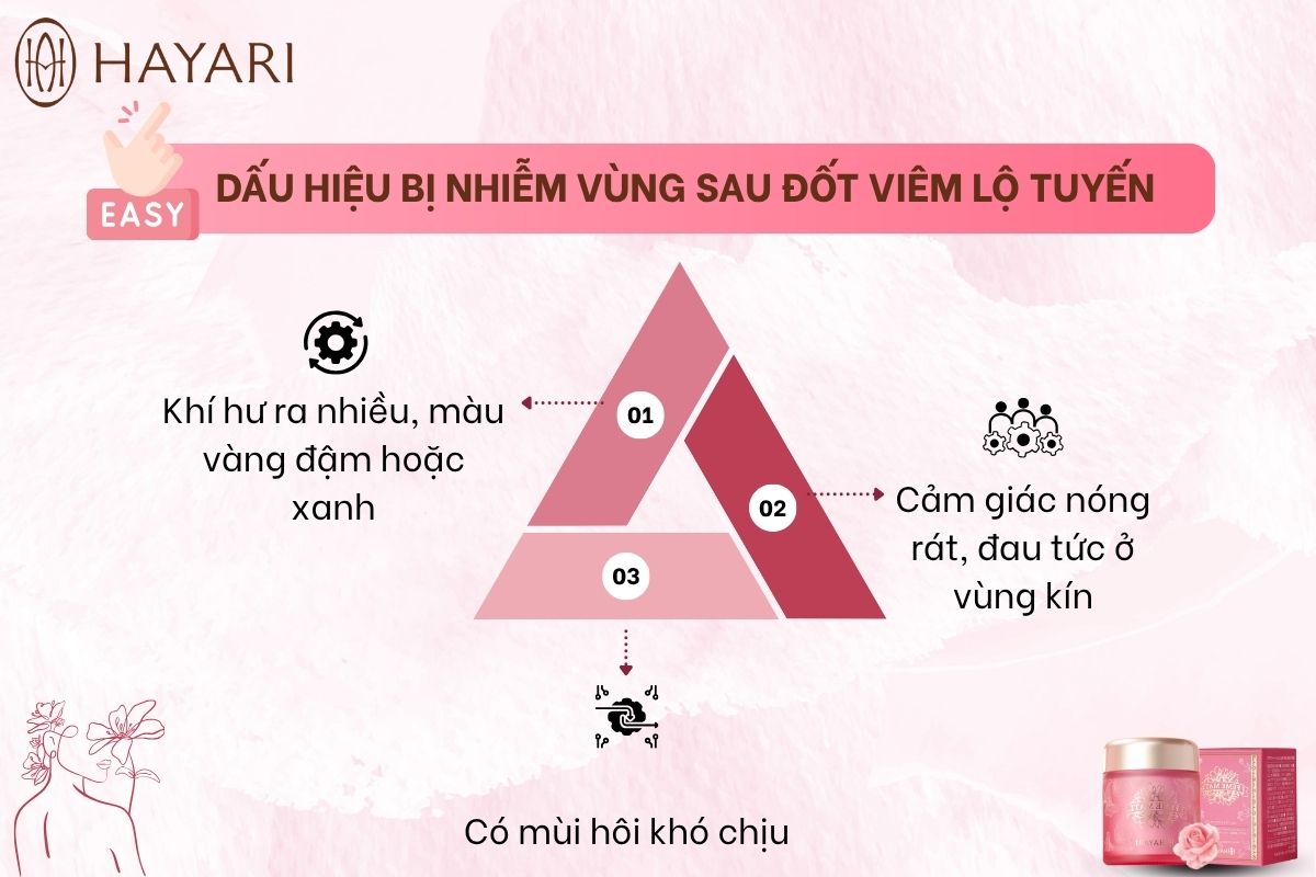 Ví dụ: Chị Lan (29 tuổi) sau khi đốt viêm lộ tuyến được 1 tuần thì thấy dịch âm đạo có mùi nồng, kèm đau rát. Khi đi khám, bác sĩ kết luận chị bị nhiễm trùng sau thủ thuật do vệ sinh chưa đúng cách và phải dùng thêm kháng sinh để điều trị.