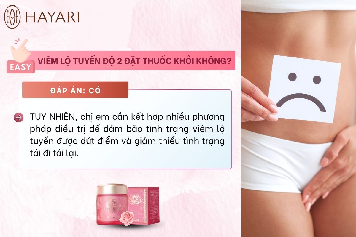 •  Viêm lộ tuyến độ 2 đặt thuốc có khỏi không? Có thể điều trị khỏi khi kết hợp đúng phương pháp: thuốc âm đạo, kháng sinh và can thiệp ngoại khoa khi cần thiết.