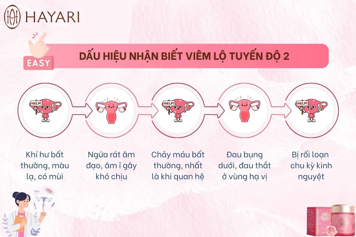 Thông thường viêm lộ tuyến độ 2 là chị em đã nên đi gặp  bác sĩ để thăm khám và chữa trị kịp thời. Dưới đây là một số hiệu mà chị em có thể dễ quan sát và cảm nhận: