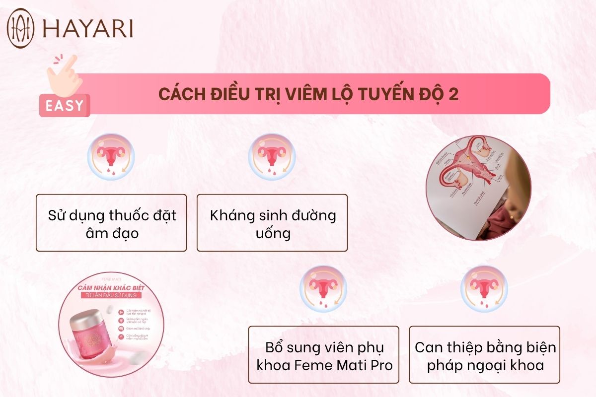 Khi viêm lộ tuyến độ 2 đặt thuốc không đáp ứng hoặc tổn thương quá rộng, bác sĩ sẽ cân nhắc các phương pháp can thiệp như phương pháp dao LEEP là  sử dụng dòng điện tần số cao để cắt bỏ vùng tổn thương một cách chính xác. Ngoài ra còn có phương pháp đốt laser để loại bỏ các tế bào tuyến bị viêm.